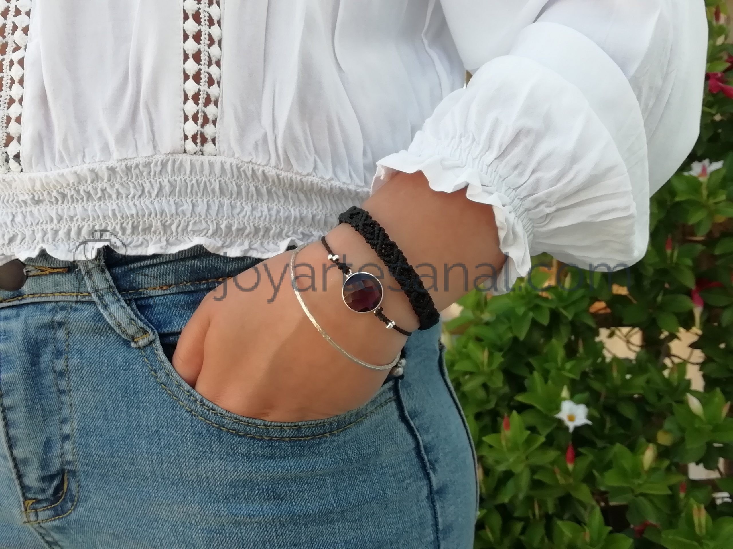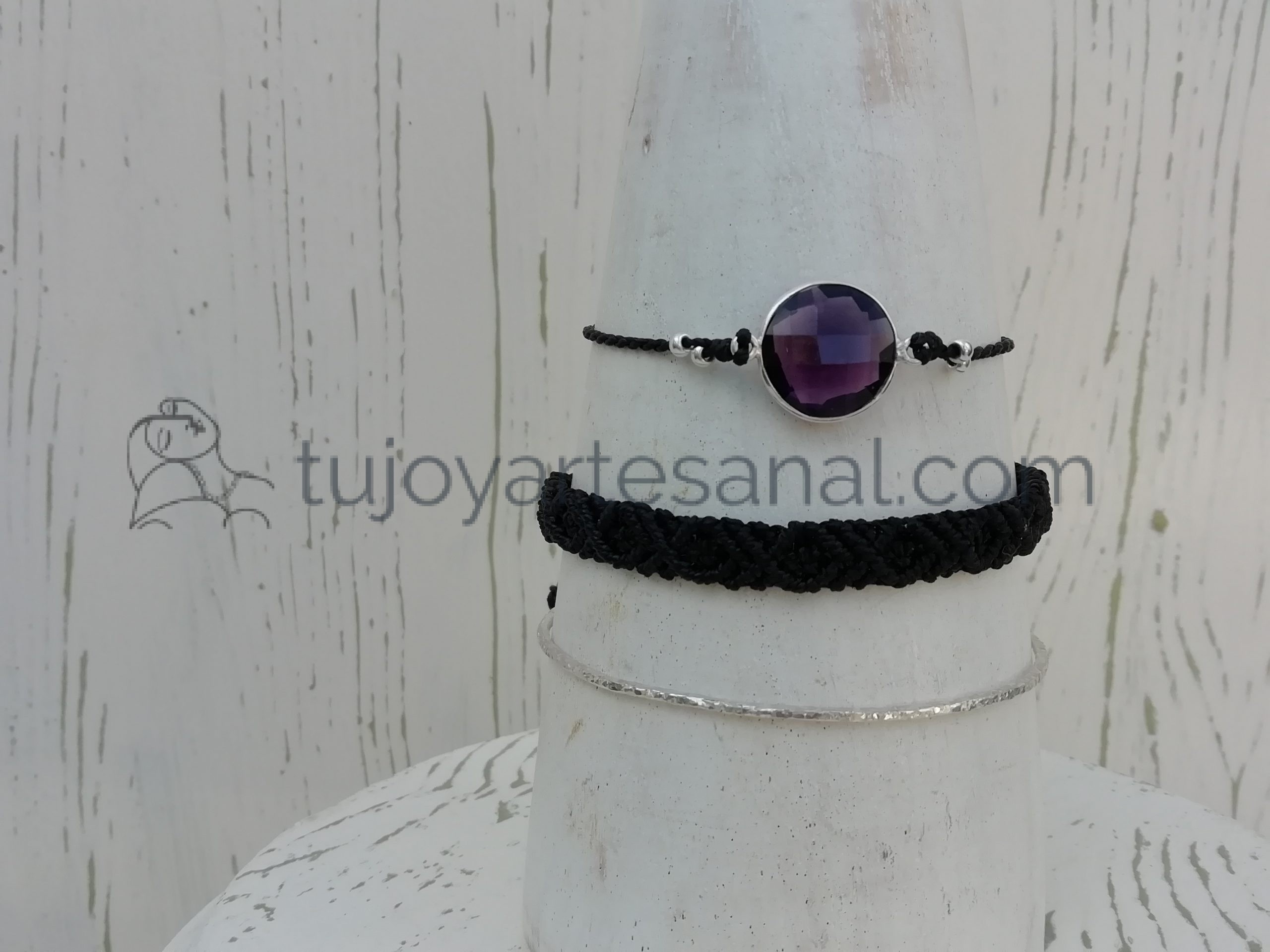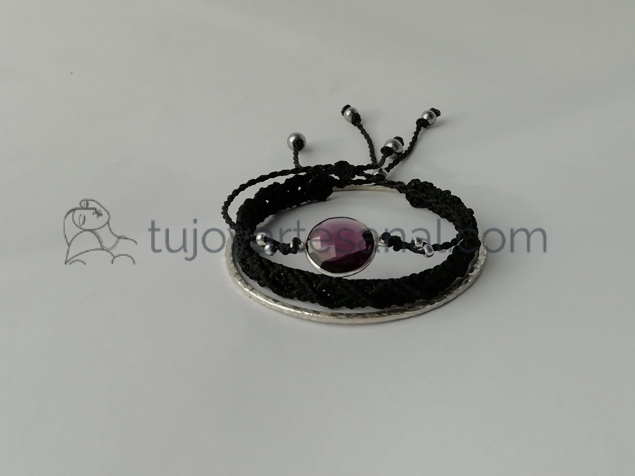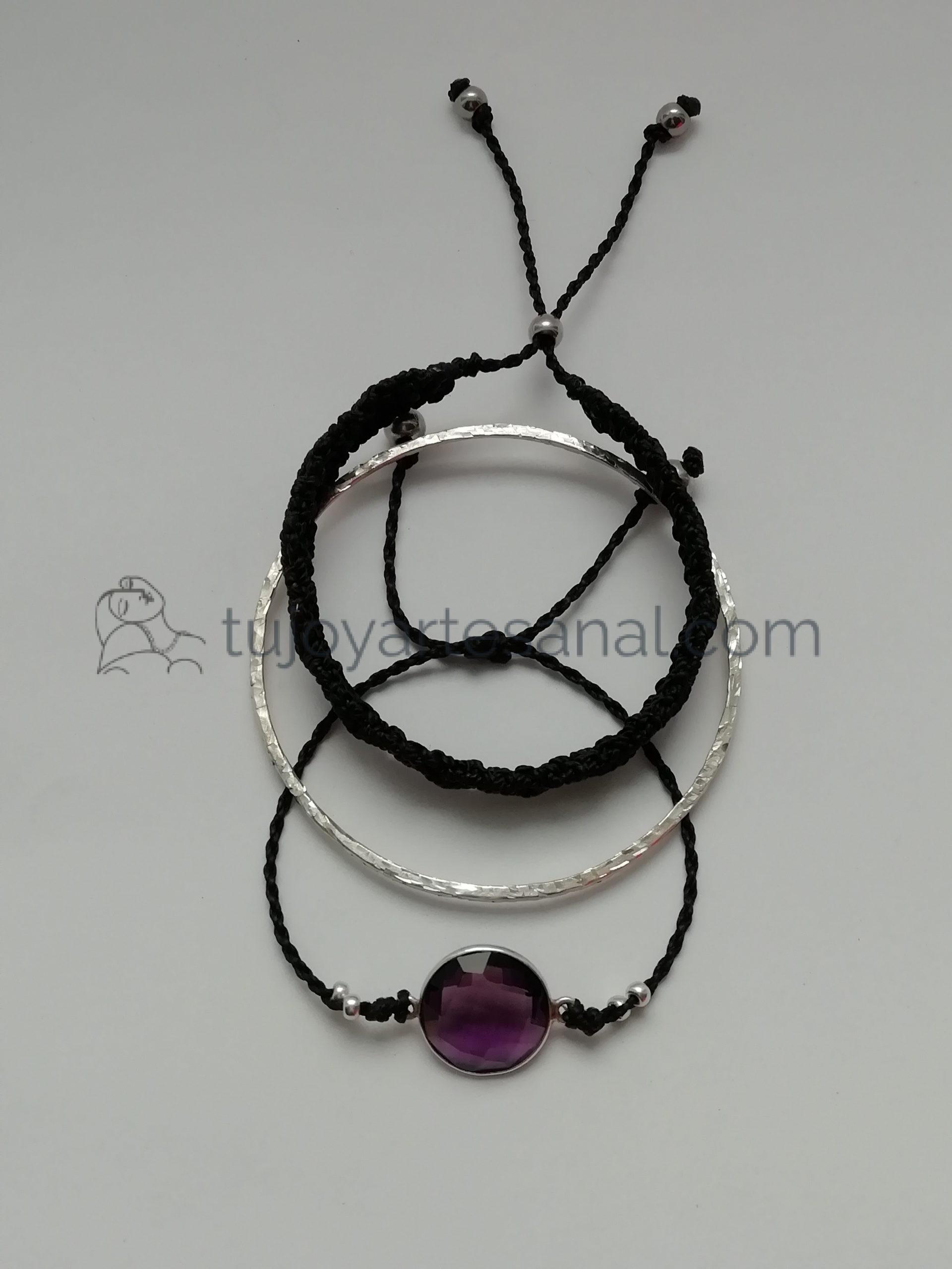 Conjunto Cala del Mago consta de tres pulseras hechas artesanalmente. La primera es una pulsera de Plata de Ley rígida y fina con efecto martilleado y acabado brillo, la segunda es una pulsera de hilo color negro ajustable con una piedra natural llamada Amatista engarzada en Plata de Ley, y una tercera pulsea hecha de hilo color negro ajustable.